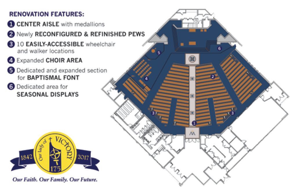 Church architecture has changed over the years. There's a distinct difference between a parish from the early twentieth century and a 1960's layout. Though the past renovation of Our Lady of Victory was wonderful and absolutely necessary, there developed over time many needs for repairs and restorations; in the process, we had an idea. The original OLV structure demanded respect and reverence while the present church is warm and inviting. Both are and were equally beautiful and sacred, but we were curious about something. Could we combine the two? Could we warm the hearts of community members and allow a space for a deeper, more reverential relationship with God? So we decided to try. Our vision and mission, was to bring back the reverence, but keep the invitation.