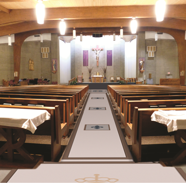 In this rather large undertaking, we created the center aisle, tiled in ceramic with the seal of Our Lady at its base and the fleur de lis, a symbol for the lily (a special emblem of the Mother of God), guiding the priest to the Altar, just as Mary guides us all to Jesus. At the foot of the sanctuary, we brought in a bit of the past with an exact image from the 1908 design, a true melding of the two generations. The old carpet was replaced with new throughout the other aisles, as well as the flooring beneath the pews. The pews themselves were cut to fit the space and refinished to shine, kneelers and all. The sacred liturgical music has prospered as well as we expanded the choir area for a better musical experience. The Baptismal Font was also moved to a permanent location under the Holy Family sculpture near the choir. This allows for more seasonal displays during May Crowning, Easter, Christmas, and other celebrations.