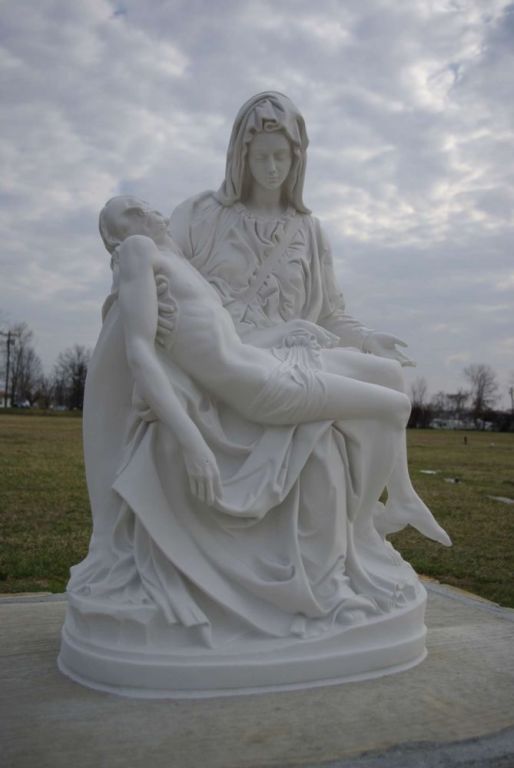 Fr. Reutter was asked to help search out an appropriate statue for the cemetery and he chose the Pieta (Mary holding the body of Jesus) made of an Italian marble composite material.